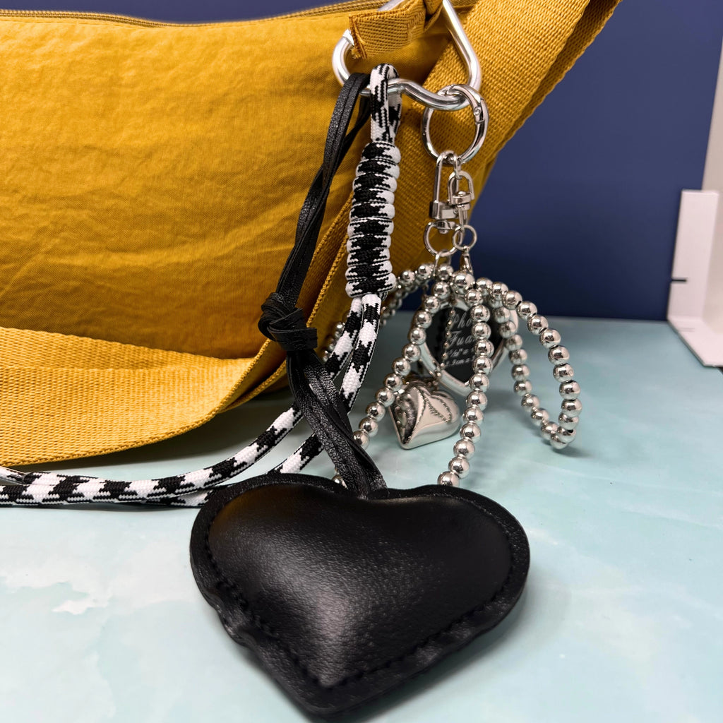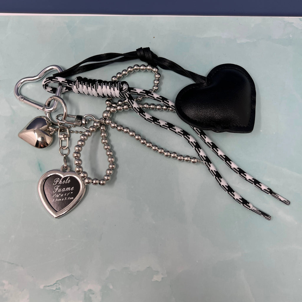 Elevate your everyday accessories with this bold and stylish black heart keychain cluster. Featuring a soft faux leather heart, a silver-tone ball chain bow, and multiple silver heart charms—including a heart-shaped picture frame and an engraved “Love” charm—this accessory is perfect for those who lean into a little edge and shine. With monochrome black-and-white rope detailing and a secure lobster clasp, this keychain is perfect for adding a personal touch to your favorite handbag, backpack, or keyring. Whether you’re embracing a Y2K aesthetic, goth-core vibes, or just want to carry a little love with you, this piece is an instant statement.