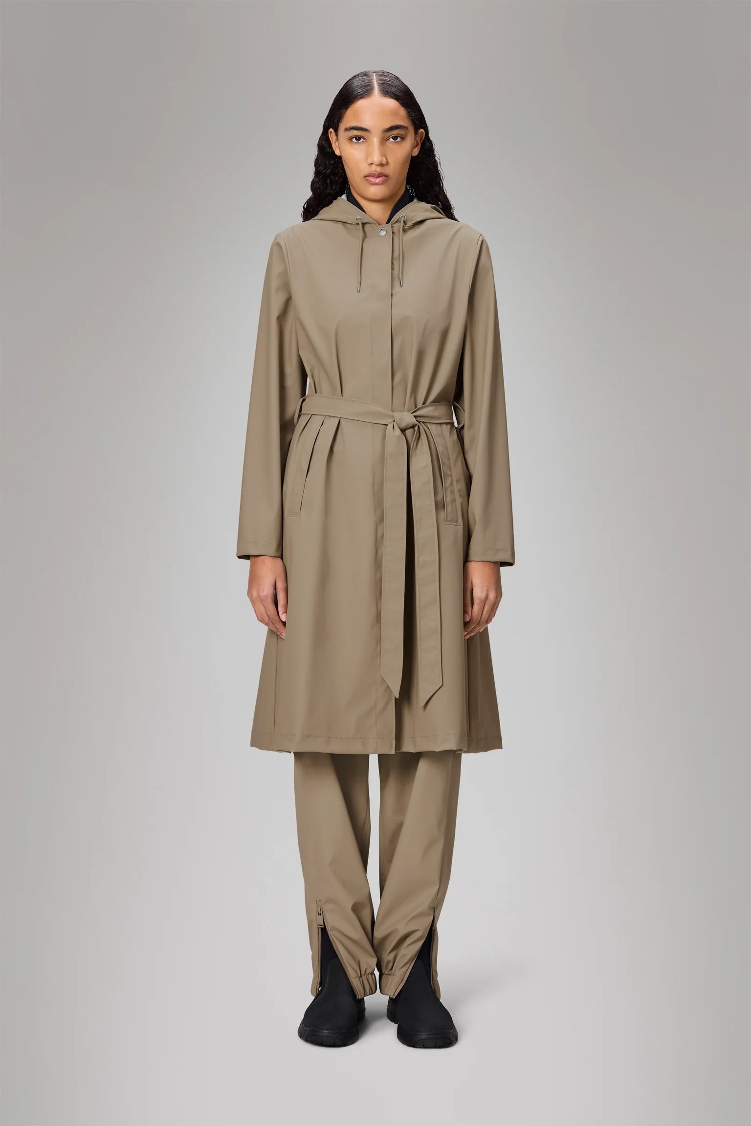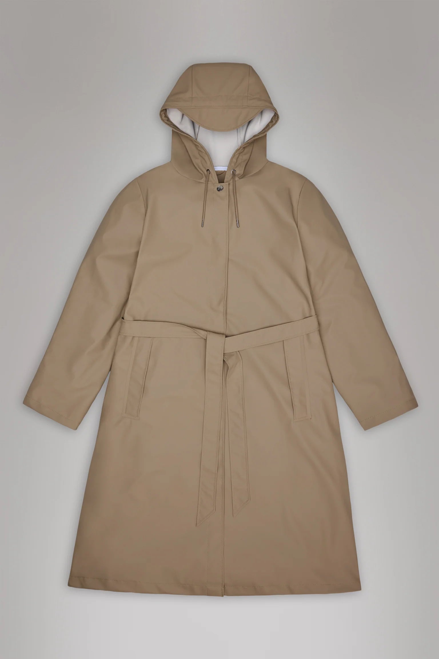 A-line Jacket Longer is a women’s raincoat characterized by its A-shaped silhouette and belt that elegantly accentuates the waist.
