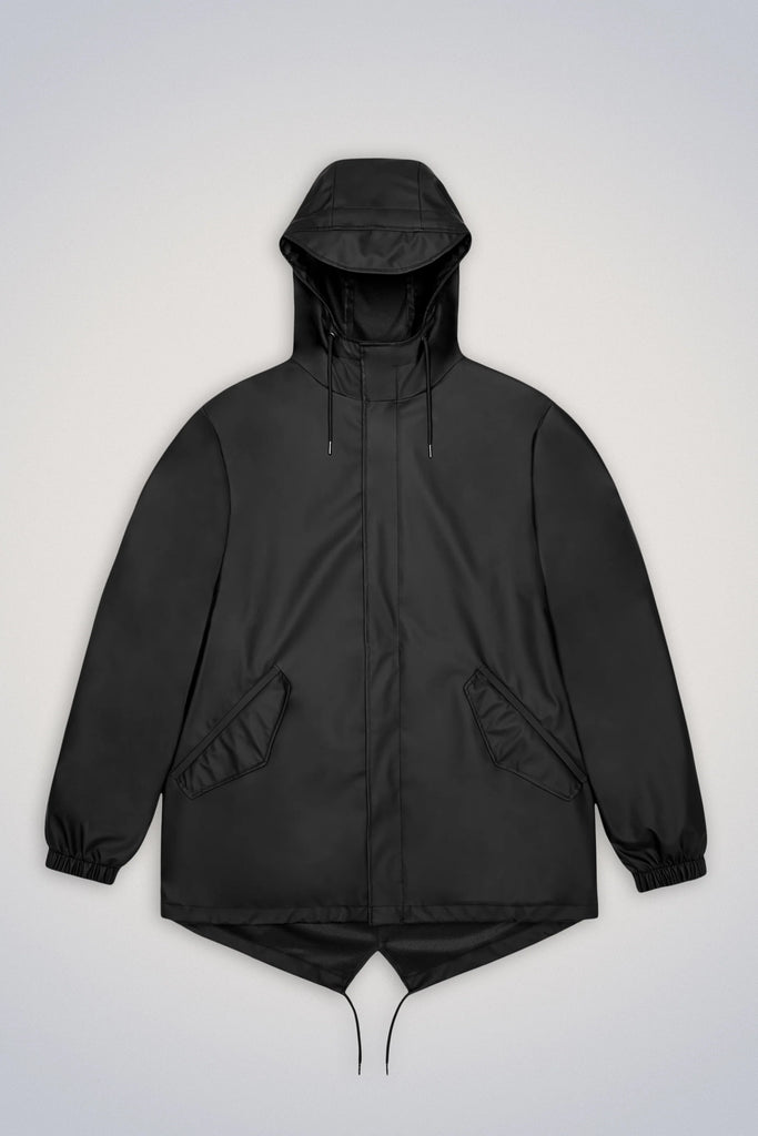 Fishtail Jacket is a unisex raincoat characterized by its pared-back aesthetic and drawstring fishtail hem. The design has a casual fit with a sloping hem. The full-length zip closure is concealed by a minimal snap-fastened placket with concealed snap fastenings. Fishtail Jacket features utility-inspired pockets, elasticated cuffs, vented back yoke, and a drawstring hood with signature built-in cap.