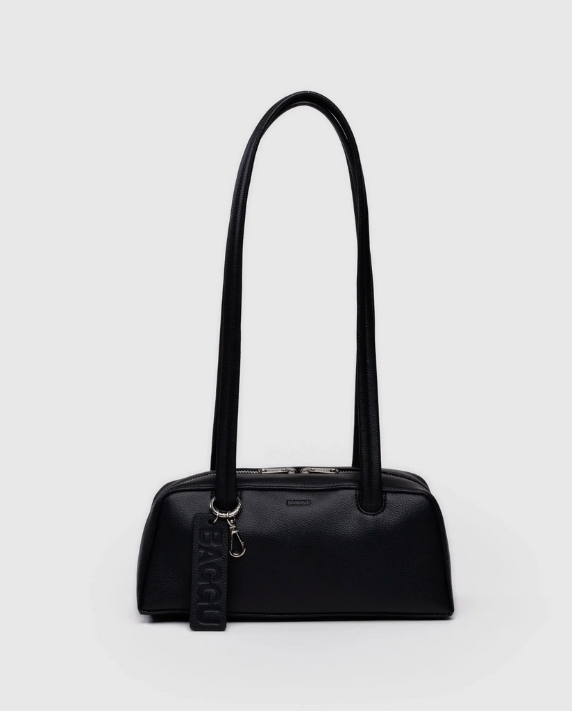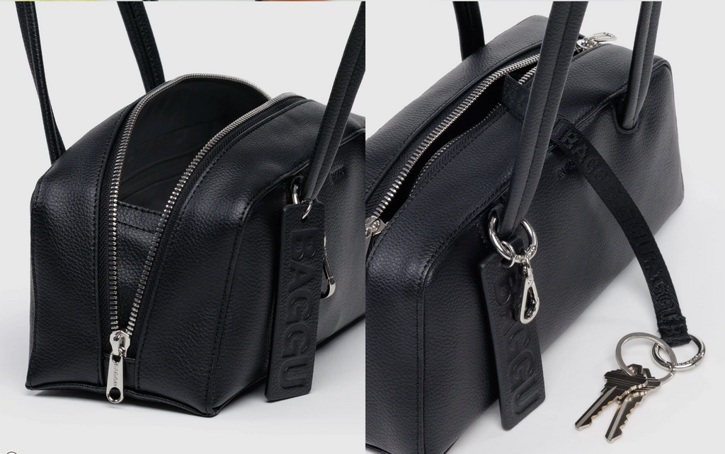 A small recycled leather bowler bag designed to be accessorized, with four charm loops and a clip ring. An interior zip pocket keeps things secure and in reach. Fits your phone, wallet, keys, and more.