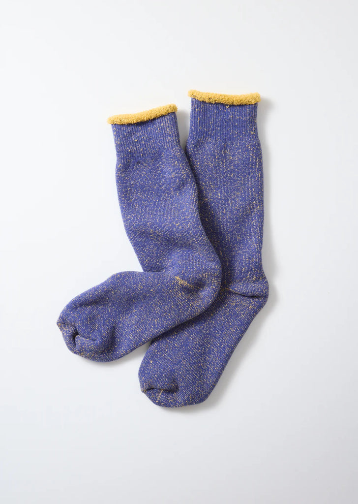 As the name suggests, these pile socks are fully reversible and can be worn inside out. The design is inspired by reversible college T-shirts from the 1970s. Each pair features contrasting cotton yarns on the inside and outside for a distinctive two-tone look.